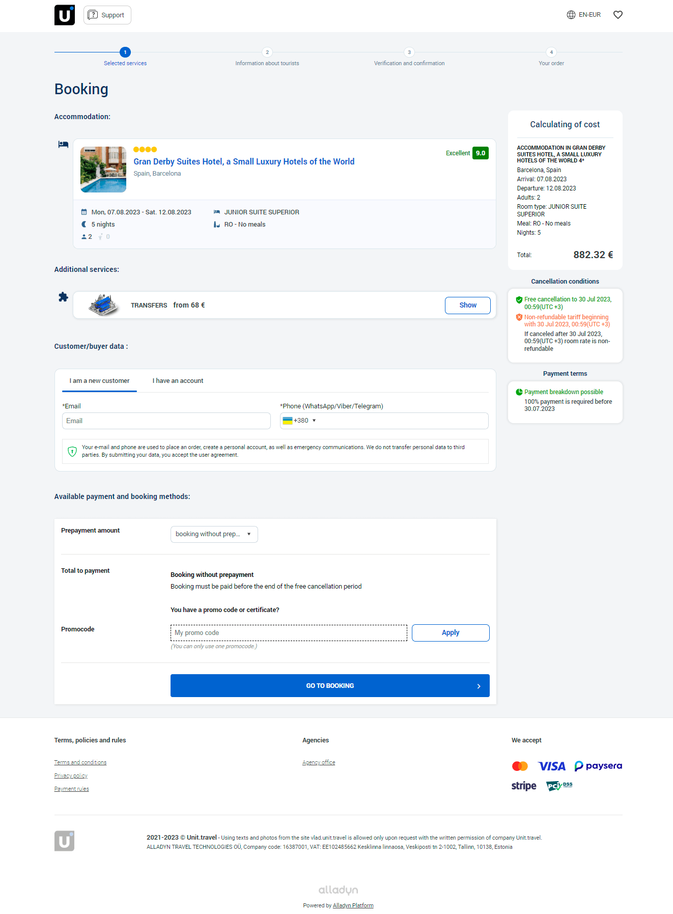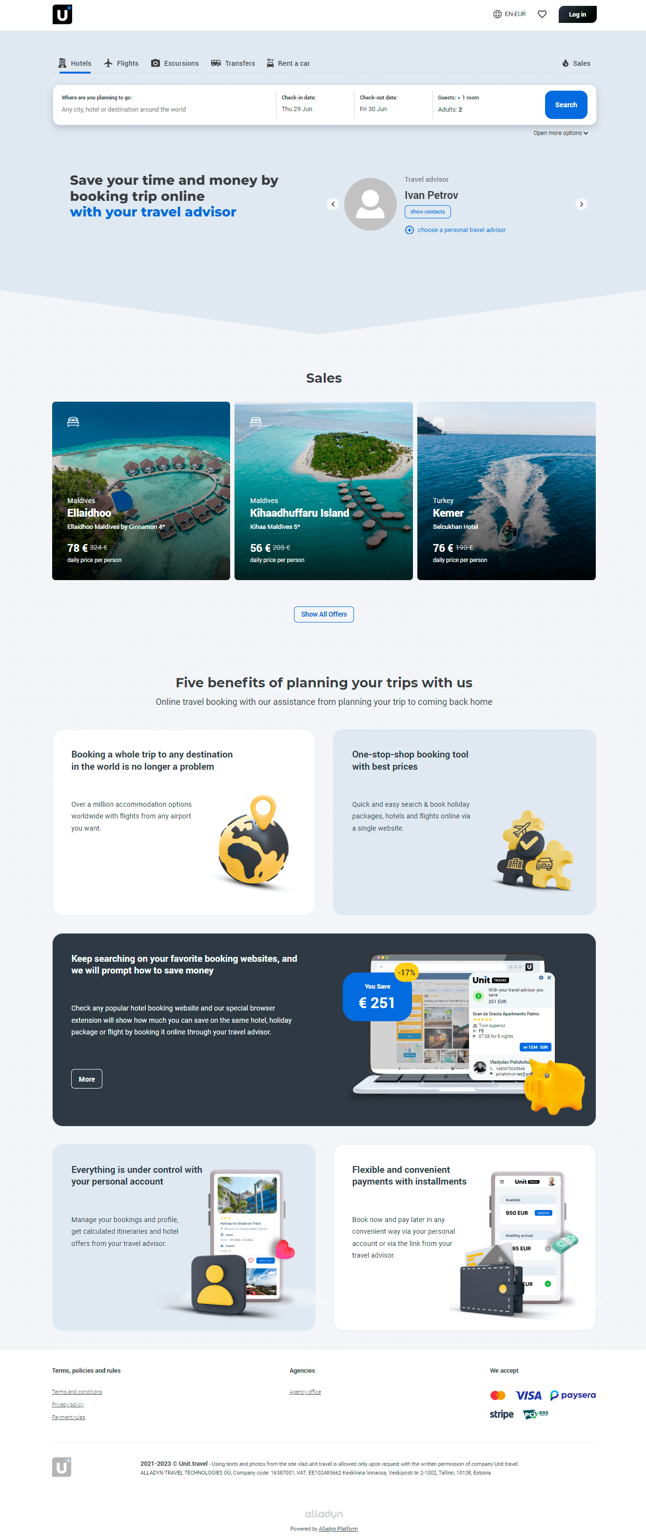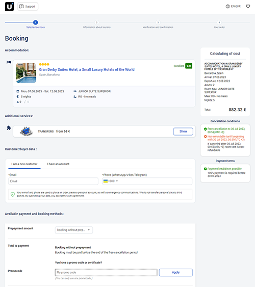 Online ödeme Unit.Travel işlem platformu hesabına yapılır ve ödeme otomatik olarak gönderilir, böylece tutarın bir kısmı tedarikçiye gider ve kalanı başvuruya ilişkin hizmetlerin bitiş tarihine kadar seyahat yöneticisi lehine tutulur.